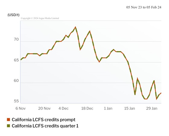 California LCFS credit prices remained under pressure, ending the week at $57.50/t and breaking recent records as the $60/t floor got broken two weeks ago. CARB's Q3 2023 data release on 31 January displayed a climb in the bank to 20.6mn t credits. In conjunction with lower D4 RIN credits, the decline in LCFS credits has helped deteriorate renewable diesel margins, which has raised costs for producers. At the US Gulf coast, indicative production margins weakened from 152¢/USG on 26 January to 149¢/USG on 2 February.